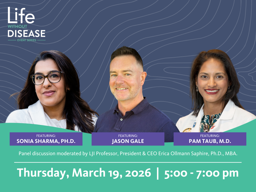 Join us for a event featuring LJI Associate Professor Sonia Sharma, Ph.D., UC San Diego Health cardiologist Pam Taub, M.D., FACC, FASPC, and award-winning health journalist Jason Gale. Dive into the science of post-viral diseases and learn about the urgent efforts to help patients recover from long COVID. This panel discussion will be moderated by LJI Professor, President & CEO Erica Ollmann Saphire, Ph.D., MBA.